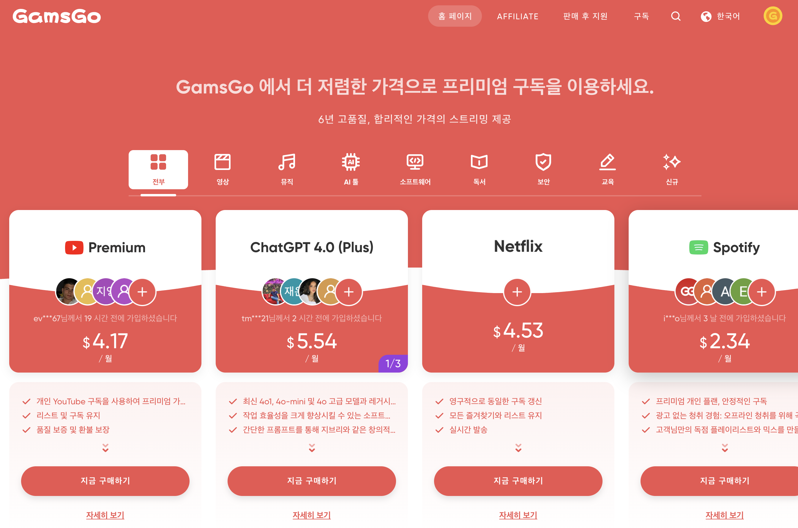 겜스고는 디지털 구독 서비스를 여러 사용자와 나눠 쓸 수 있도록 제공하는 합법적인 공유 플랫폼입니다. 챗GPT를 포함해 넷플릭스, 유튜브 프리미엄, 디즈니+, 오피스365, 캔바, 미드저니 등도 함께 지원합니다. 구독 시 할인코드(CAVHM)를 입력하면 추가 할인을 받을 수 있습니다.